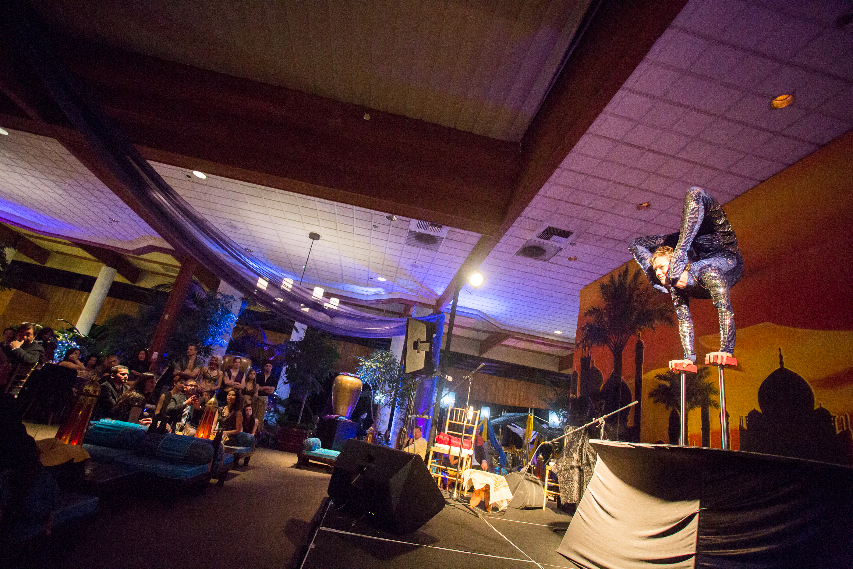 Karen Bevels Custom Catering & Events asked us to be a part of an Arabian Nights themed holiday party for a local bay area company. We were so stoked for the opportunity to be a part of such a fun and creative party! The event started with a large Moroccan Tent that covered the front entrance. It then opened up into a whole new world of color, laughter, music, food, and dancing! Belly dancers, fire spinners, life size golden camels and palm trees, set around an indoor oasis at the Bay Club in Santa Clara made for a truly awe inspiring event! Arial acrobats dangled from the air in the “Spice Market Bazaar” while contortionists performed amazing acrobatic feats in the “Maharaja’s Grand Tent!” We were so lucky to provide lighting & D.J. services for this event and can’t wait to see what theme they pick next year! Thanks so much to Karen Bevels Catering & Events & Orange Photography